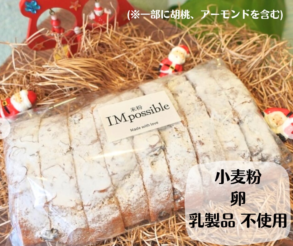 米粉(国産)、ラム酒漬けレーズン、くるみ、クランベリー、甜菜糖、オリーブオイル、アーモンドプードル、シナモンパウダー、オオバコ、イースト、塩